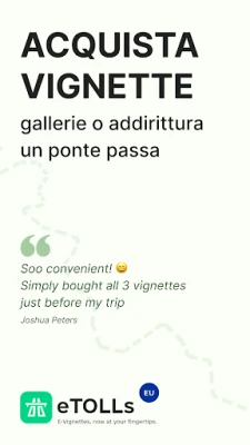 Immagina di percorrere le strade d'Europa, libero da preoccupazioni sui pedaggi e le vignette. Con eTOLLs EU, questa visione diventa realtà. La nostra applicazione è la tua compagna essenziale per navigare attraverso i sistemi di pedaggio in Austria, Bulgaria, Svizzera, Repubblica Ceca, Ungheria, Romania, Slovenia e Slovacchia, con l'aggiunta di nuove nazioni prevista a breve. Dimentica le lunghe code e la ricerca dell'ufficio giusto: eTOLLs EU ti permette di acquisire le vignette necessarie con pochi semplici tocchi, garantendo la piena conformità e tutelandoti da spiacevoli sanzioni. È la soluzione definitiva per un'esperienza di viaggio più fluida e serena.