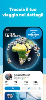 FindPenguins è l'app di viaggio innovativa per pianificare, tracciare e condividere le tue avventure. Trasforma i tuoi viaggi in video aerei mozzafiato e crea un profilo unico con foto e storie. Converte i ricordi in un libro di viaggio personalizzato con un semplice click.